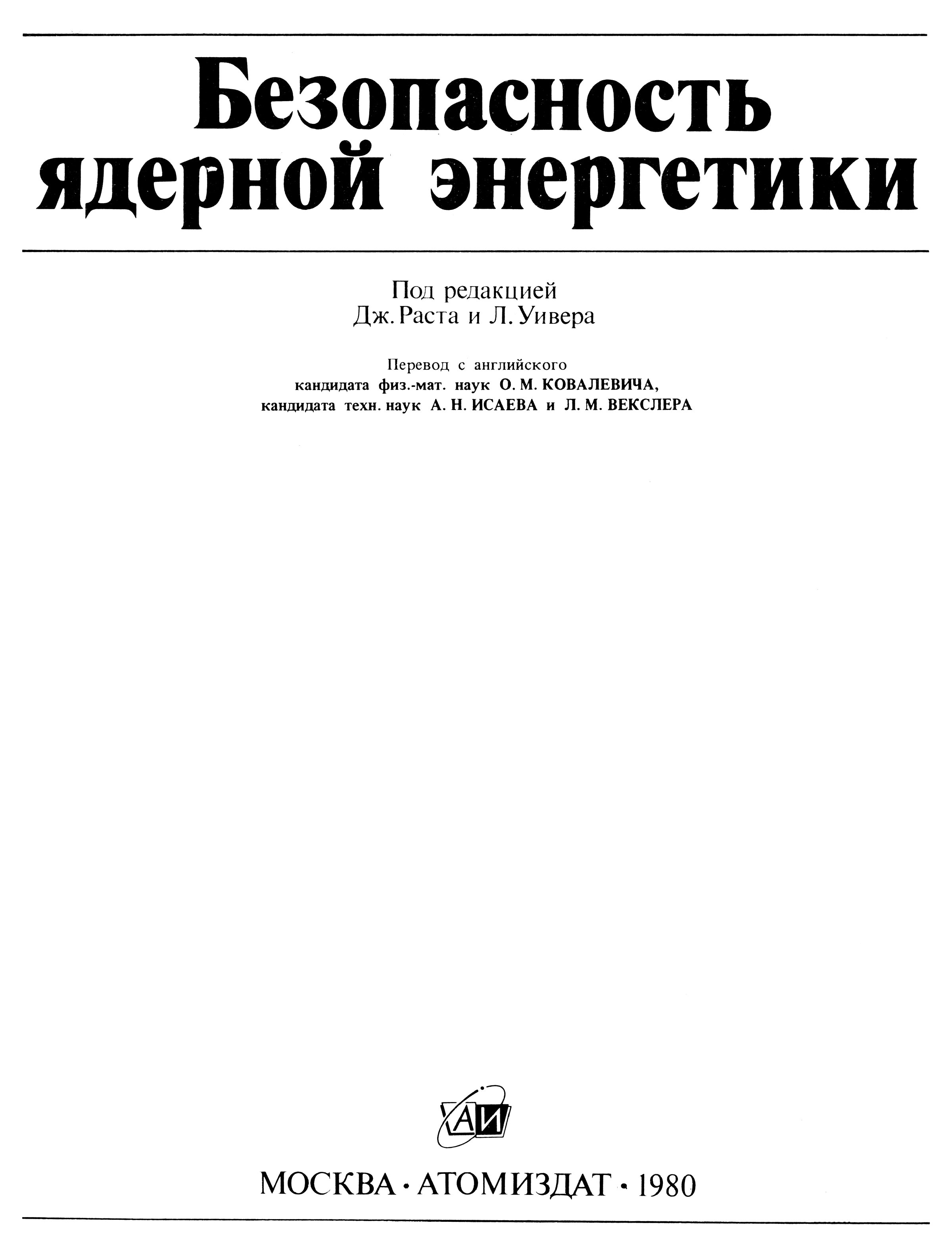 Безопасность ядерной энергетики : [Сб. статей] / Под ред. Д. Раста, Л. Уивера; Пер. с англ. О. М. Ковалевича и др. — М. : Атомиздат, 1980. — 154 с. : ил. — Библиогр. в конце статей.