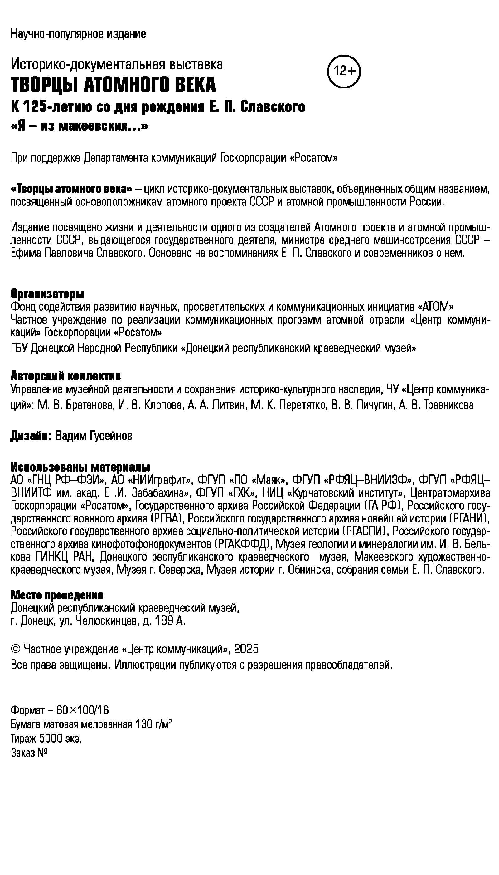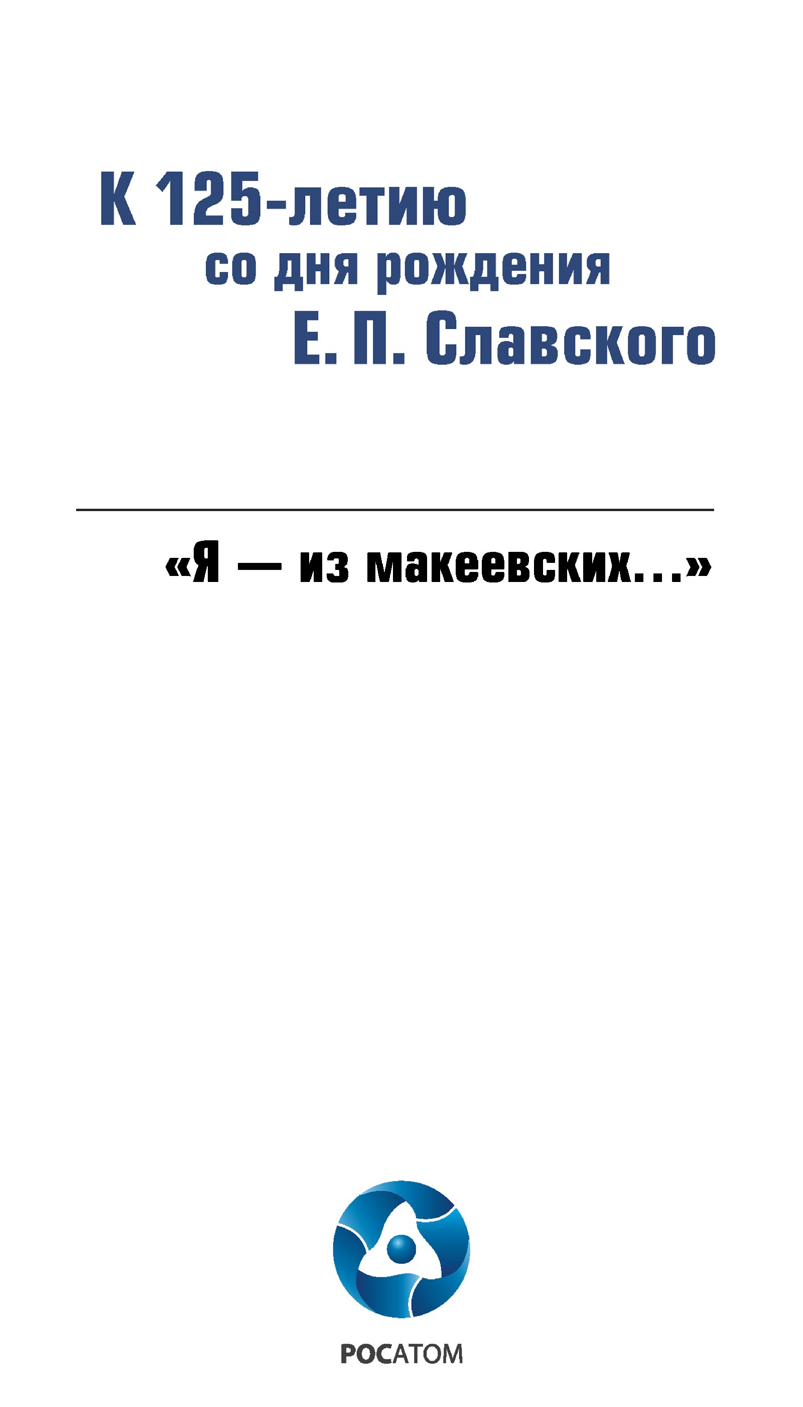 «Я — из макеевских...» К 125-летию со дня рождения Е. П. Славского : Историко-документальная выставка / М. В. Братанова, И. В. Клопова, А. А. Литвин, М. К. Перетятко, В. В. Пичугин, А. В. Травникова ; Росатом. — М.: «Центр коммуникаций», 2025. — 40 с.: ил. — (Творцы атомного века).
