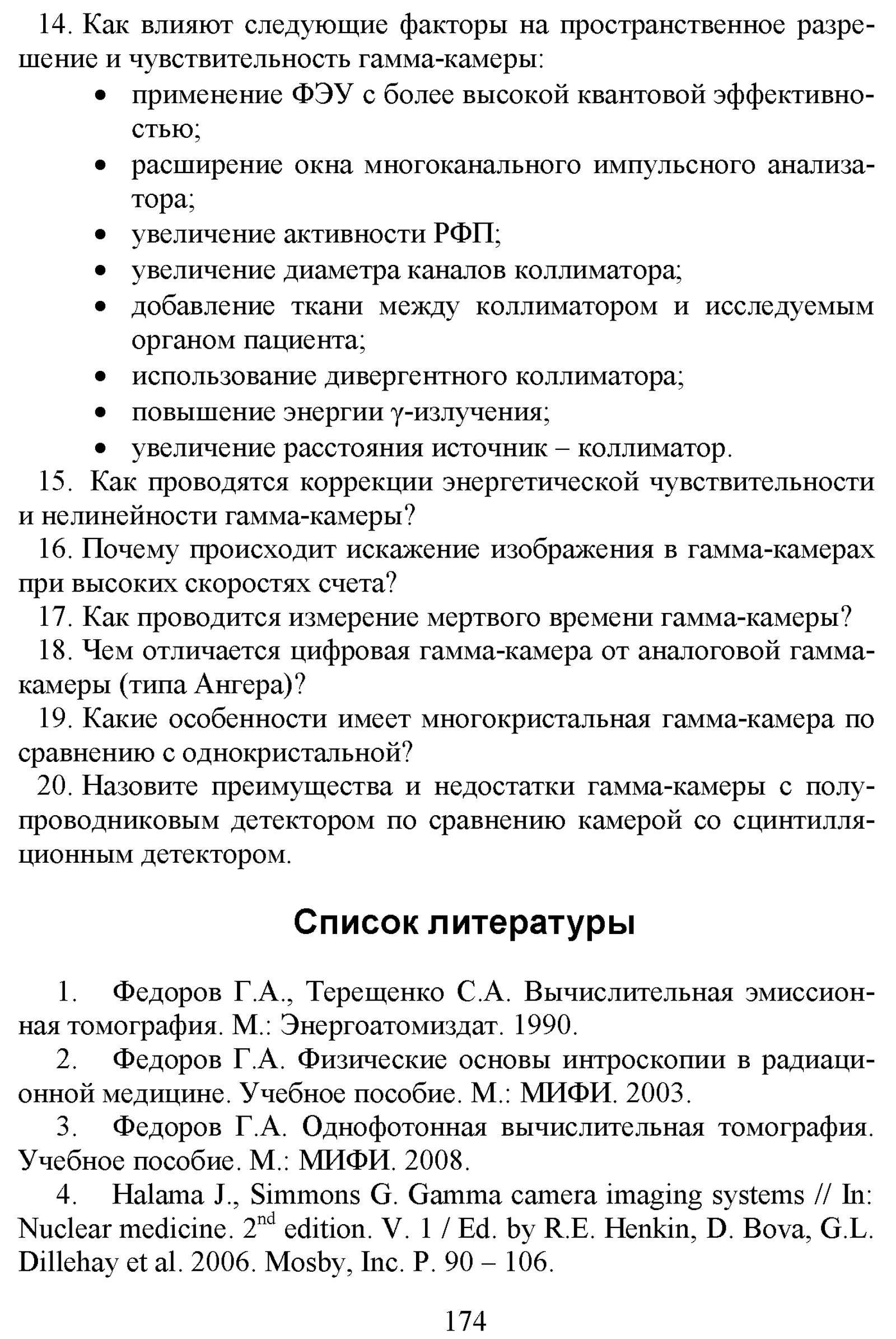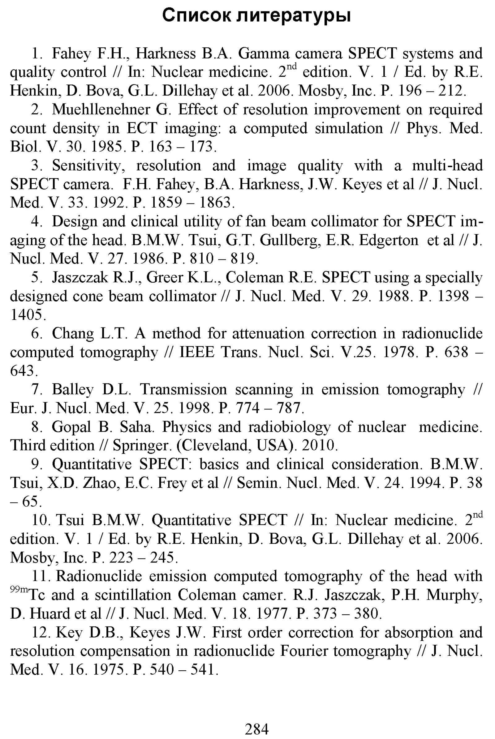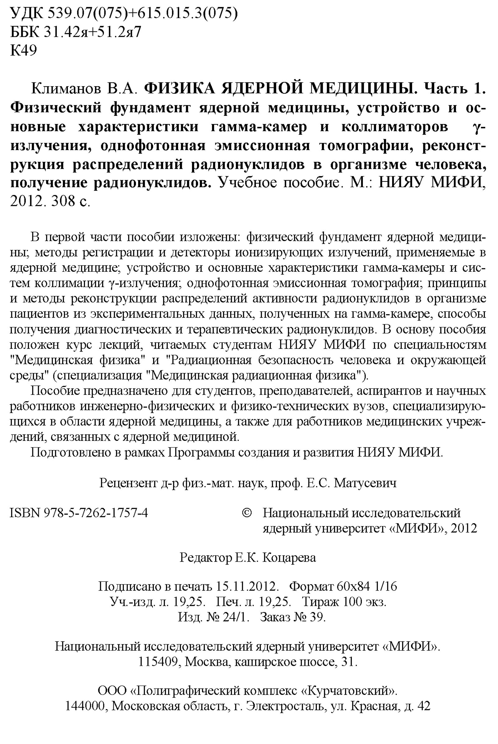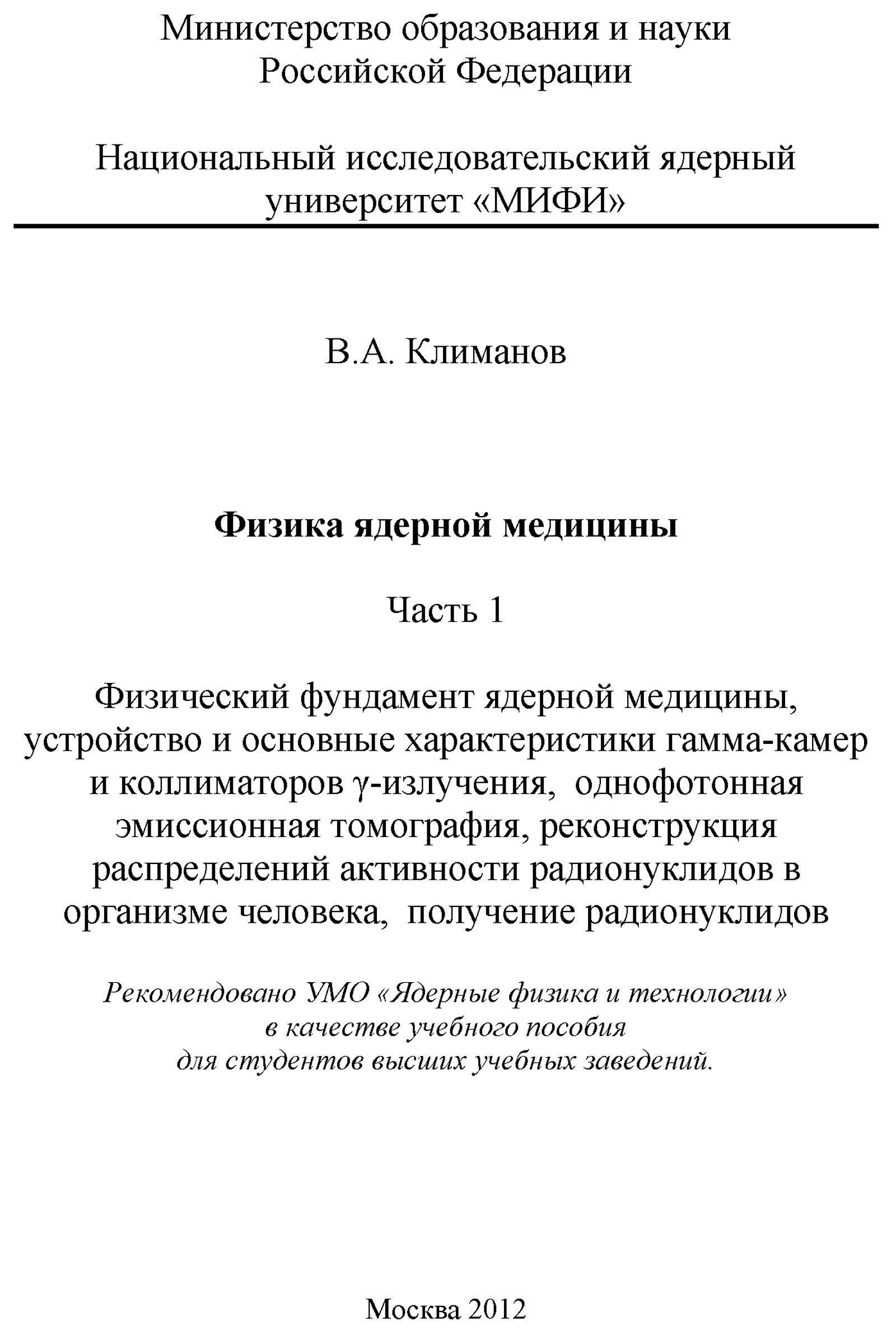 Климанов В. А. Физика ядерной медицины. Ч. 1 : Физический фундамент ядерной медицины, устройство и основные характеристики гамма-камер и коллиматоров [гамма]-излучения, однофотонная эмиссионная томография, реконструкция распределений активности радионуклидов в организме человека, получение радионуклидов / М-во образования и науки Рос. Федерации, Нац. исслед. ядер. ун-т «МИФИ». — М. : Национальный исследовательский ядерный университет «МИФИ», 2012. — 307 с. : ил. — Библиогр. в конце гл. — (Библиотека Ядерного университета).